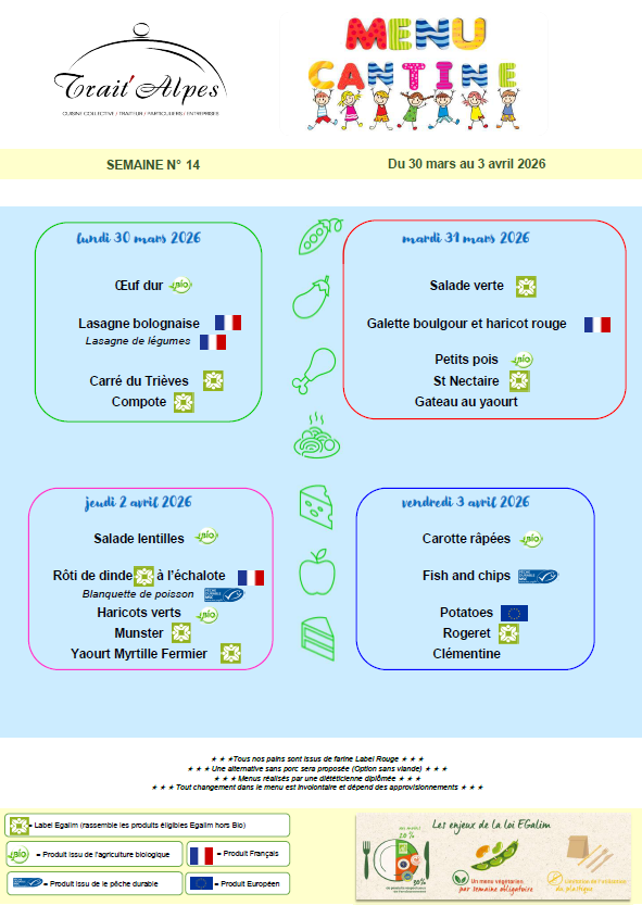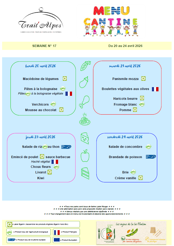 - Les menus sont confectionnés par la société de restauration Trait'Alpes de Saint Martin-le-Vinoux.